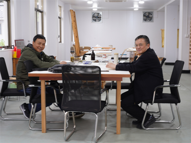 2021年5月13日,休寧縣政法委書記洪學(xué)軍與著名藝術(shù)大師陳老師來公司調(diào)研參觀楮皮紙制作。
