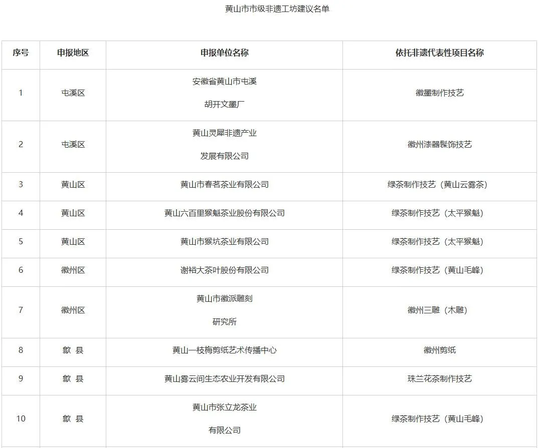 根據(jù)《安徽省文化和旅游廳安徽省人力資源和社會保障廳安徽省農(nóng)業(yè)農(nóng)村廳關(guān)于印發(fā)<安徽省非遺工坊管理辦法>的通知》要求,市文化和旅游局、市人力資源和社會保障局、市農(nóng)業(yè)農(nóng)村局聯(lián)合組織開展了市級非遺工坊認(rèn)定工作。經(jīng)申報主體自愿申請、各區(qū)縣初審?fù)扑]、市級評審復(fù)核,形成市級非遺工坊建議名單,共19家,具體名單如下所示: